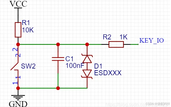 - D2 ESD 二极管:它能起到静电保护的作用,防止 IO 口被静电干扰或损坏,是否添加取决于 PCB 的成本和防护级别哦。