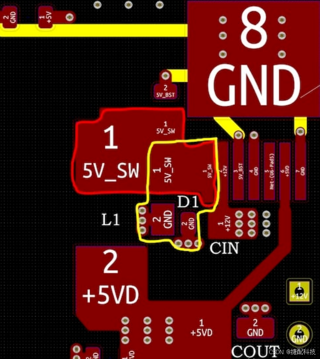 在审视其布局时,我们发现采用低侧功率二极管的非同步降压稳压器设计存在明显问题。当隐藏 PCB 上的铜填充后,能清晰看到:其一,高 di/dt 环路过大;其二,Cin 或 Cout 的 GND 节点没有过孔连接(被过孔覆盖);其三,交换节点尺寸还可进一步缩小。这表明该设计中电流环路控制不佳,且因平面间缺乏通孔,电流返回源路径不明确。