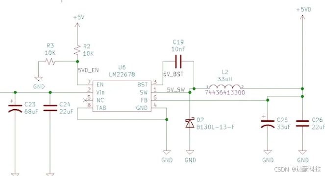 以 LM22678 5A 转换器的线路板布局为例,该转换器输入电压 Uin 为 12V,输出电压 Uout 为 5V,属于非同步降压转换器,采用 B130L - 13 - F 肖特基二极管作为低侧开关元件。
