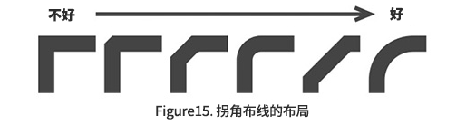 要是把拐角布线设计成直角,问题就来了。在直角处,阻抗会发生变化,这就好比水流在突然转弯的管道口会产生漩涡一样,电流波形也会变得紊乱,进而产生 “反射” 现象,导致波形畸变。对于那些开关节点等高频布线而言,反射的影响可不容小觑,极有可能使 EMI 恶化。所以,我们在设计拐角布线时,最好采用 45° 或圆弧状,而且弯曲的半径越大,阻抗的变化就越小,从而能有效降低噪声风险。