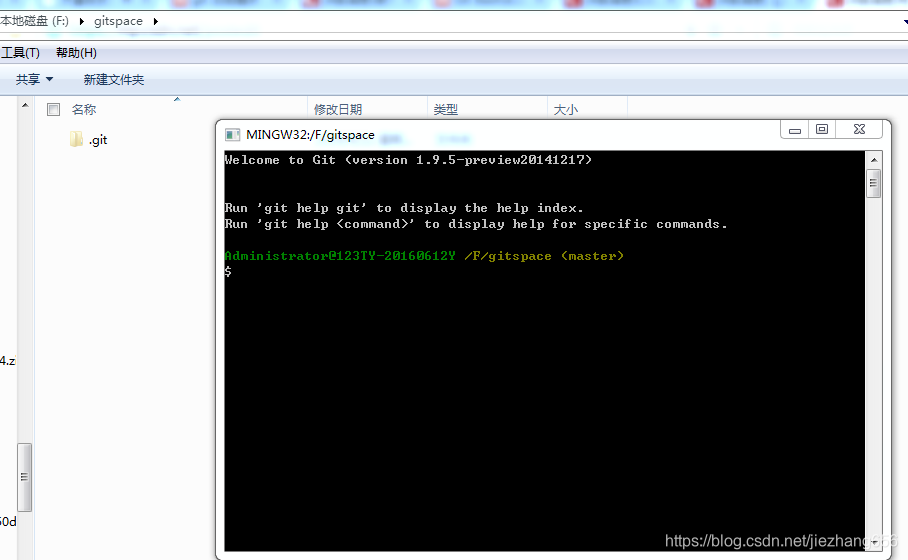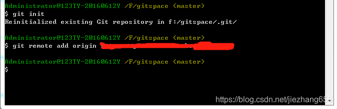 5、在gitspace文件夹中执行下面命令,完成初始化(因为u在第三步已经进行了初始化,所以这里再次做初始化的时候会显示已存在)