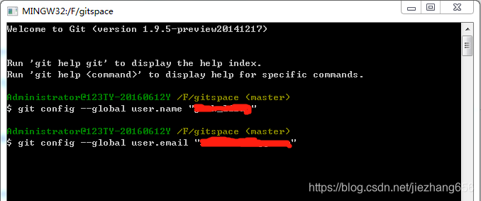 4、进行基础配置,作为 git 的基础配置,作用是告诉 git 你是谁,你输入的信息将出现在你创建的提交中,使用下面两条命令: