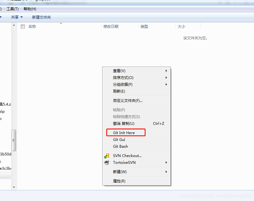 3、进入刚刚新建的文件夹,即进入“gitspace”,点击鼠标右键,选择"Git Init Here",如下图: