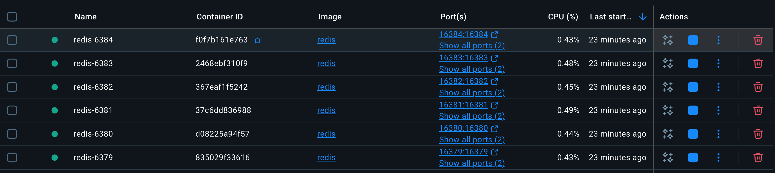 8842810ed383 redis "docker-entrypoint.s…" 46 seconds ago Up 45 seconds 0.0.0.0:6382->6382/tcp, 6379/tcp, 0.0.0.0:16382->16382/tcp redis-6382