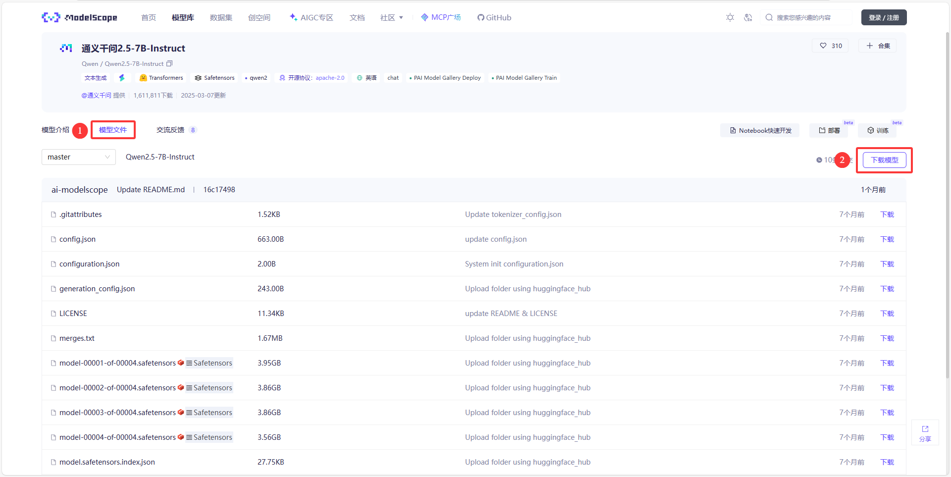 git clone https://www.modelscope.cn/Qwen/Qwen2.5-7B-Instruct.git # Qwen2.5:7B 模型