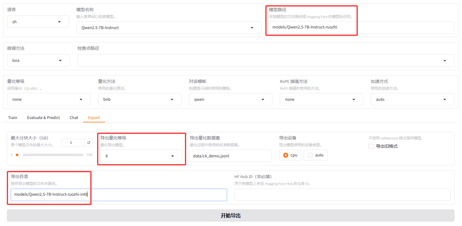 量化前需要先将模型导出后再量化。修改模型路径为导出后的模型路径,导出量化等级一般选择 8 或 4,太低模型会答非所问。