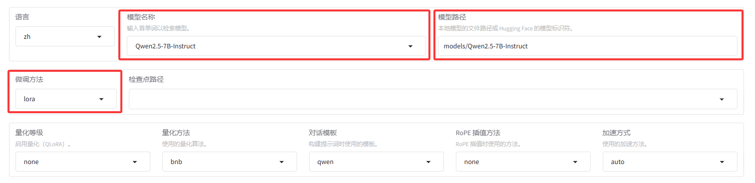 模型名称选择为待训练的模型名称,这里设置为 Qwen2.5-7B-Instruct。模型路径设置为上面下载的模型路径,例如在 LLaMA-Factory 目录下新建一个 models 文件夹,将下载的模型移动到此文件夹内,可设置路径为 models/Qwen2.5-7B-Instruct。微调方法支持 lora/freeze/full 方法,这里选择 lora 方法,其他方法对计算机配置要求较高,对个人电脑来说一般不适用。