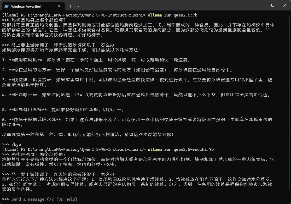 微调数据集使用“弱智吧数据集”(https://github.com/FunnySaltyFish/Better-Ruozhiba),从百度弱智吧上收集的一系列帖子,旨在启发人们娱乐性使用 ChatGPT 等 LLM 时的思路。微调模型使用阿里的 Qwen2.5:7B 模型。