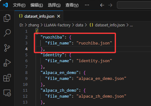 将下载好的 JSON 数据集放入 LLaMA-Factory/data 目录下,并在 LLaMA-Factory/data/data_info.json 中注册数据集。
