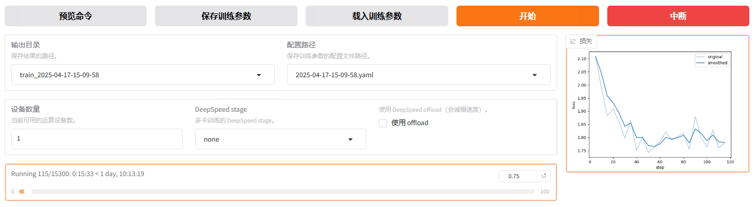 参数配置好后,点击开始,即可进行训练。训练时可以观察右侧的损失曲线,曲线长时间不下降时,即可考虑退出训练。