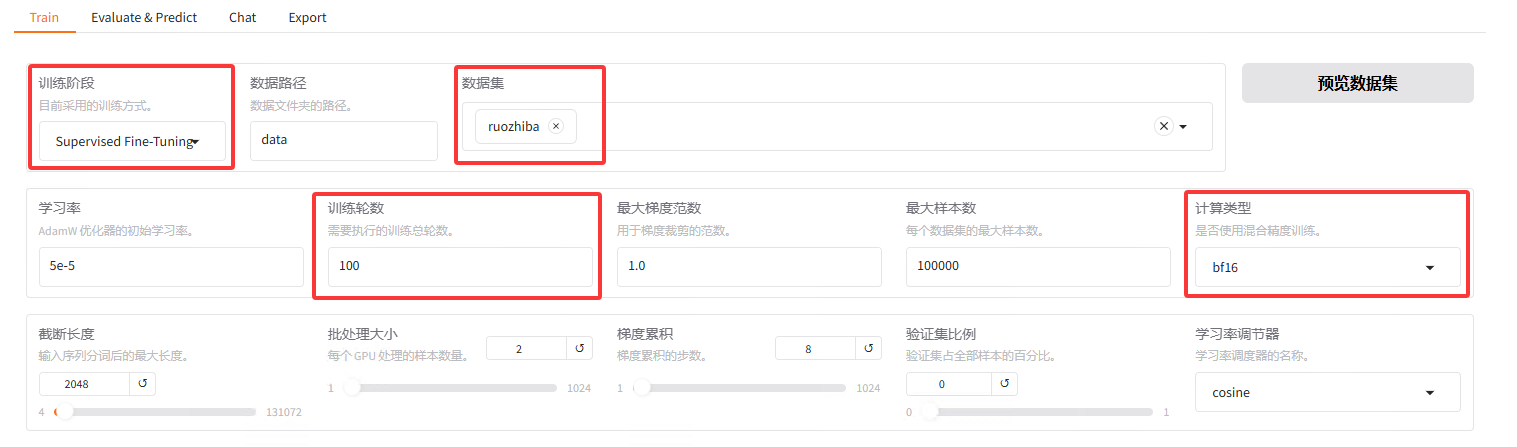 数据集选择上文注册的数据集名称,这里设置为 ruozhiba。训练轮次根据数据集大小调整,这里设置为 100。学习率通常设置为 1e-4 或 5e-5。计算类型设置为 bf16,如果你的硬件不支持,可以选择 fp16,基本上 2020 年之后的 GPU 都支持 bf16。
