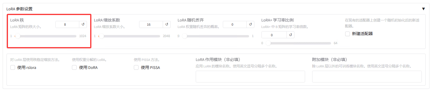接着对 LoRA 参数进行设置。其中关键的参数是秩(rank),秩的大小直接影响模型的性能和资源消耗。秩越大,引入的可训练参数越多,模型对新数据的适应能力越强,但也增加了计算和内存的需求,可能导致过拟合。秩越小,引入的可训练参数较少,减少了计算和内存的需求,但可能不足以充分适应新数据,影响模型性能。可以从较小的值开始(如8、10、12),逐步增加,观察模型性能的变化。