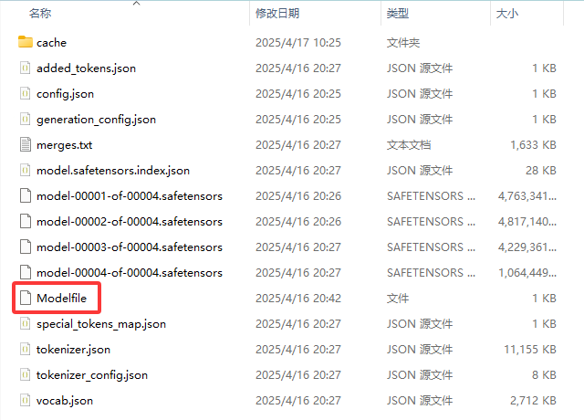 当然 LLaMA Factory 导出时也已经生成了 Modelfile 文件,直接使用即可。