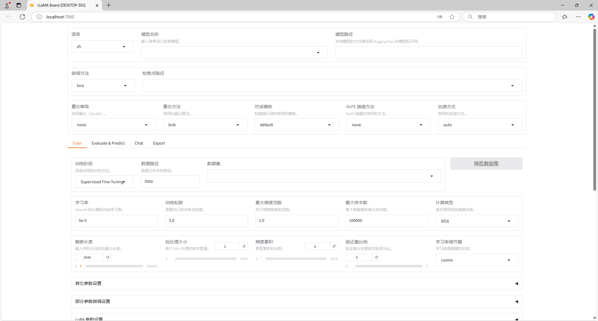 访问 http://localhost:7860/ ,进入 LLaMA Factory 的 WebUI 界面。WebUI 主要分为四个界面:训练(Train)、评估与预测(Evaluate & Predict)、对话(Chat)、导出(Export)。