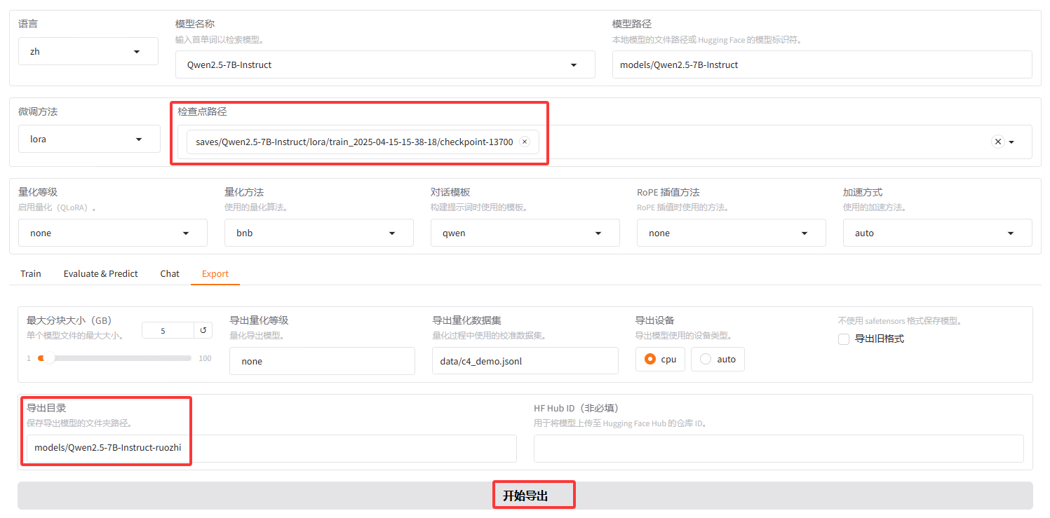 下面切换至 Export 选项卡,设置导出参数。补全检查点路径与导出目录,点击开始导出。到此为止,模型已经具备了使用能力。