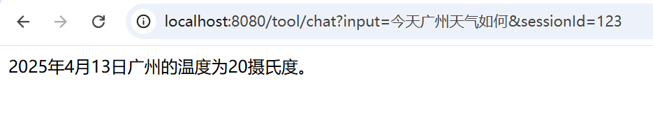 第二次会话直接输入 广州 大模型就知道我要问什么了,说明聊天记忆功能已生效。