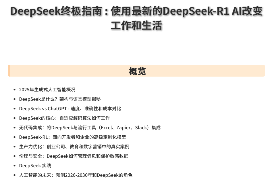 这篇文章深入探讨了2025年生成性人工智能的最新进展,重点介绍了DeepSeek这一创新工具的功能与应用。文章涵盖了DeepSeek的架构、与ChatGPT的对比、核心解码算法的工作原理,以及如何无缝集成到流行工具如Excel、Zapier和Slack中。此外,还讨论了DeepSeek的高级定制化选项、生产力优化案例、伦理与安全问题,最后展望了2026-2030年人工智能的未来发展及DeepSeek在这一过程中扮演的关键角色。