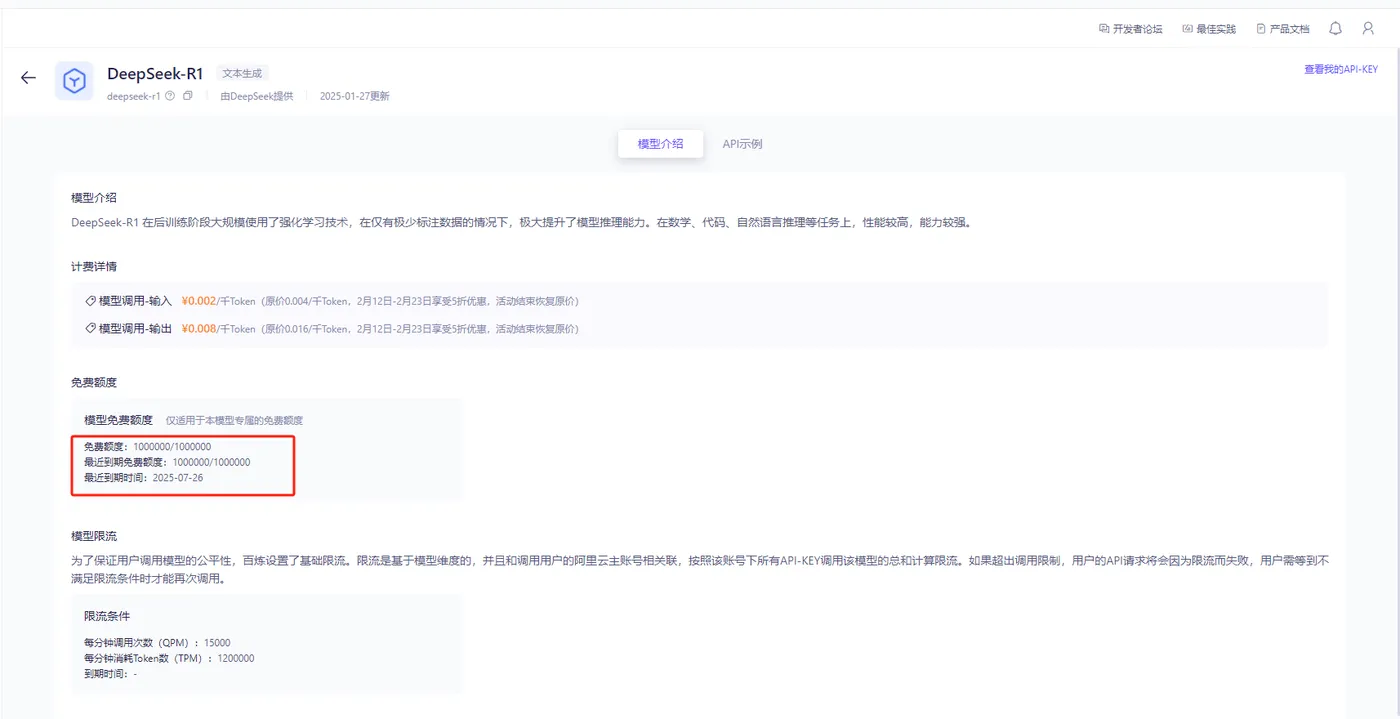 值得一提的是我们访问阿里云百炼模型广场,针对DeepSeek-R1大模型提供了100万免费额度,到期时间为2025-07-26 。这样大家0元就可以轻松体验阿里云百炼提供的DeepSeek-R1大模型。