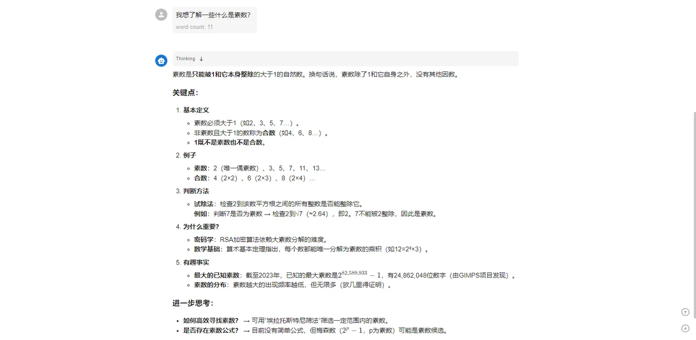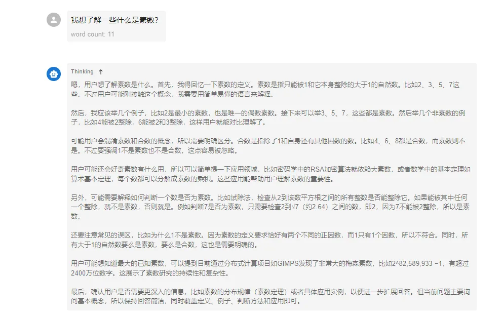 对于数学知识测试,回复还是非常详细的,也扩展了不少知识。回答的效果还是非常不错的。