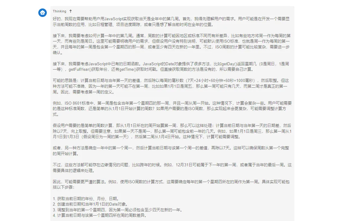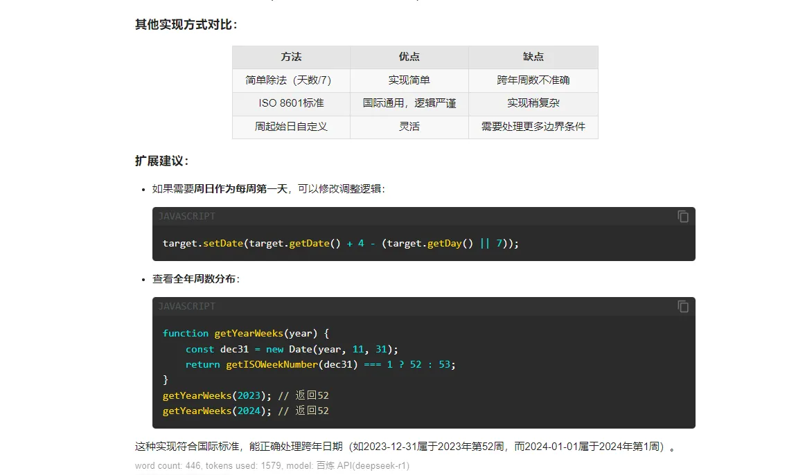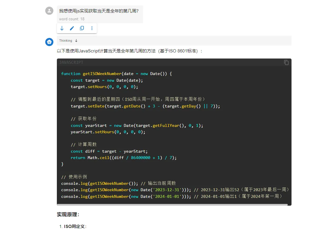 输入:“我想使用js实现获取当天是全年的第几周?”