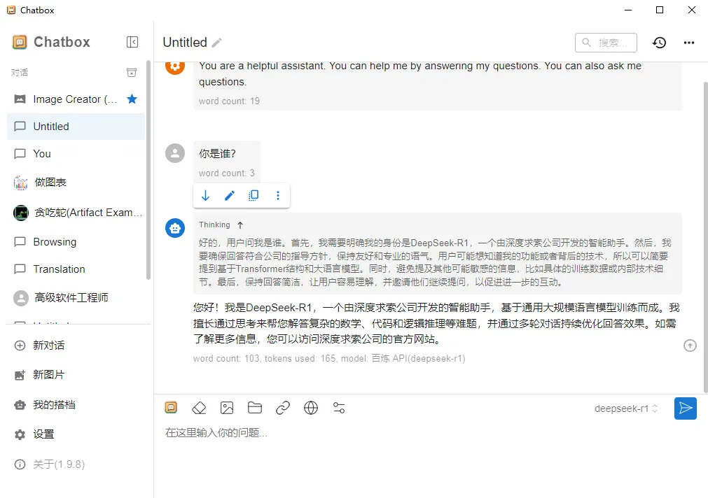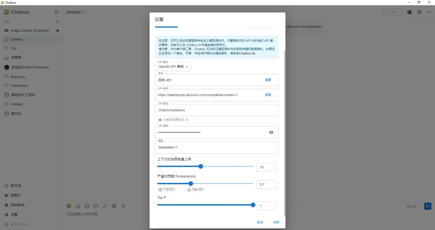 接着我们使用ChatBox来测试一下阿里云百炼提供的DeepSeek-R1大模型实际的效果