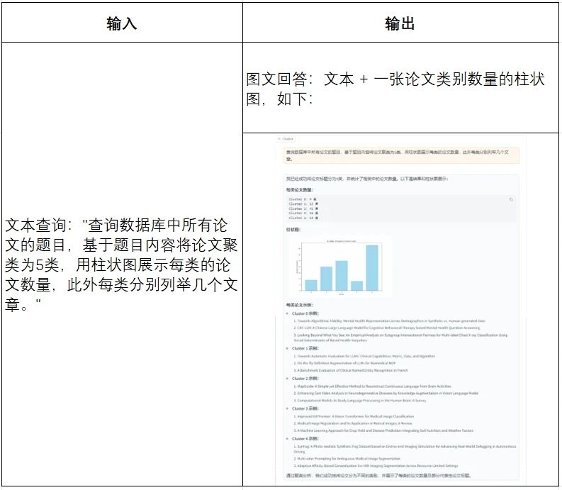 原有 RAG 仅支持文本生成,现在扩展为支持多模态输出,例如生成带有图片的回答或结合语音的解释。当输入为文本查询时,如 "查询数据库中所有论文的题目,基于题目内容将论文聚类为5类,用柱状图展示每类的论文数量,此外每类分别列举几个文章。" ,则会将相关检索结果(文本、图片)传给大模型,最后输出图文回答,如相关文本 + 一张论文类别数量的柱状图。