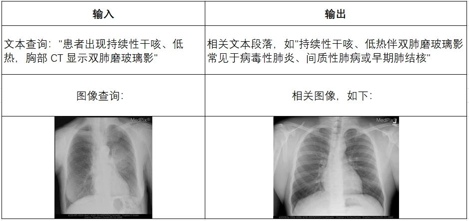 处理单一模态的查询,如文本到文本、图像到图像的匹配。例如当输入为文本查询,如 "患者出现持续性干咳、低热,胸部CT显示双肺磨玻璃影" 时,则会输出相关文本段落,如 "持续性干咳、低热伴双肺磨玻璃影常见于病毒性肺炎、间质性肺病或早期肺结核";而当输入为图像查询时,如一张胸部 CT 图像时,则会输出胸部 CT 的相关图像。