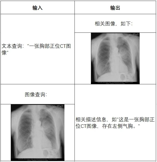 支持跨模态查询,例如文本查询匹配图像,或图像查询匹配文本。例如当输入为文本时,如 "一张胸部正位CT图像",则会输出最相关的胸部 CT 的图片;而当输入为胸部 CT 的照片时,则会输出相关描述文本,如 "这是一张胸部正位CT图像,存在左侧气胸"。