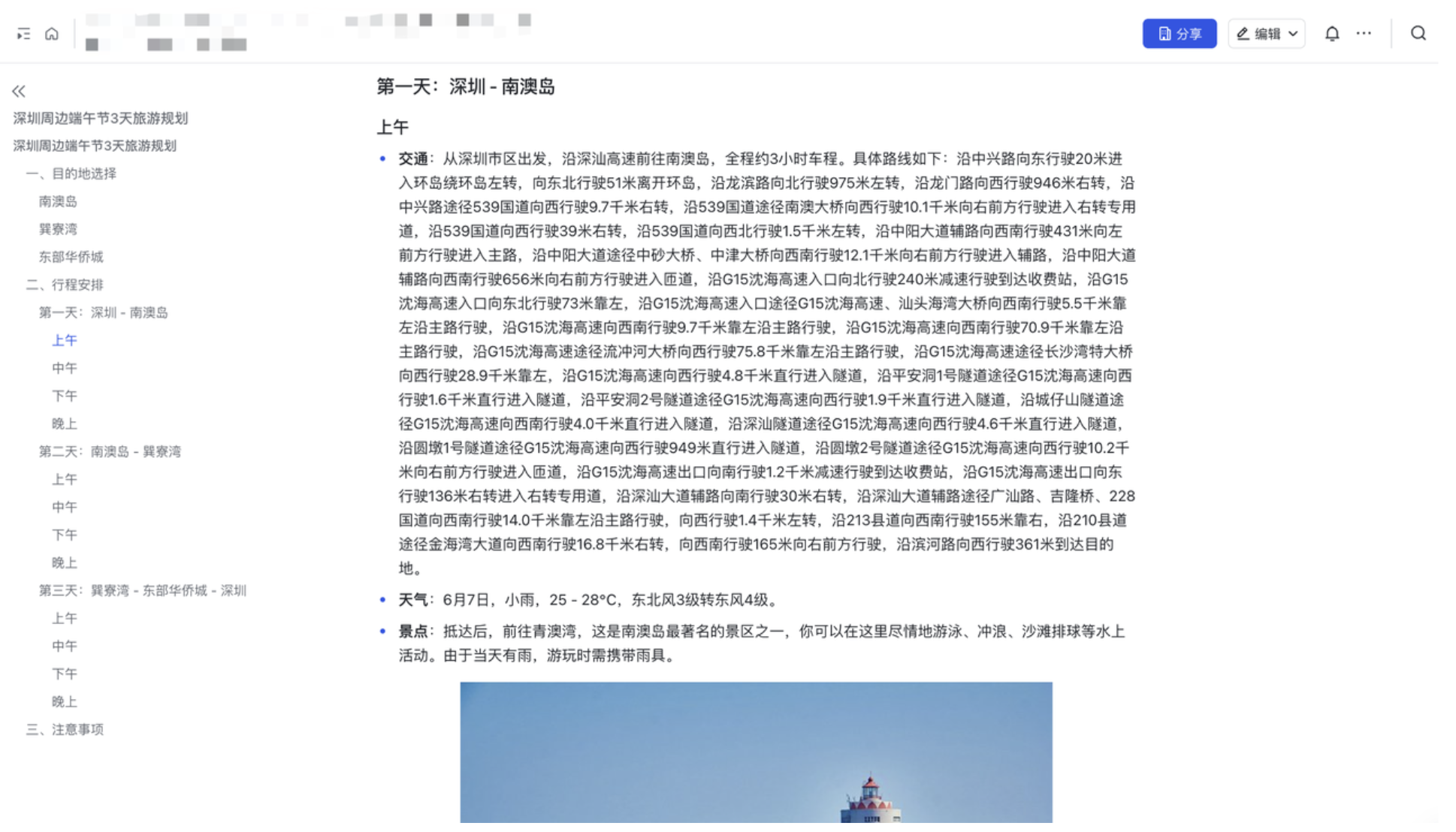 同样按照前文思考、工具调用、完成任务的步骤,扣子空间给了我一个飞书云文档的链接,打开之后,更新的旅游攻略里有了非常详细的交通行车规划,以及天气预报。
