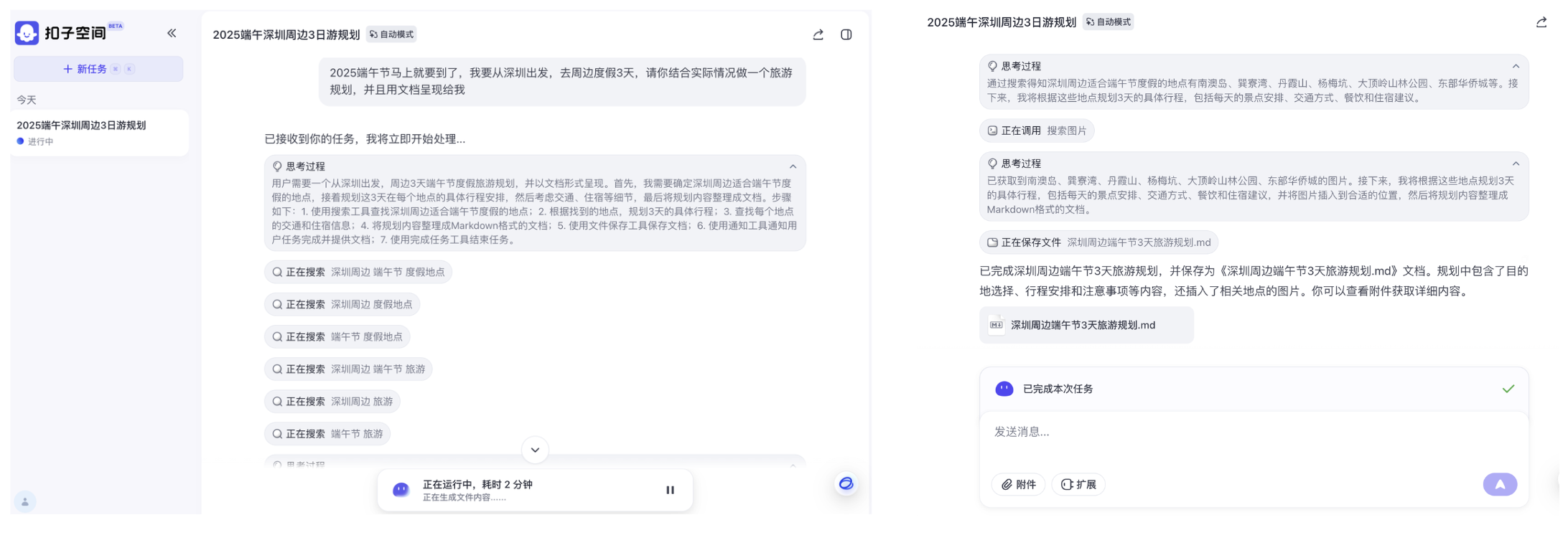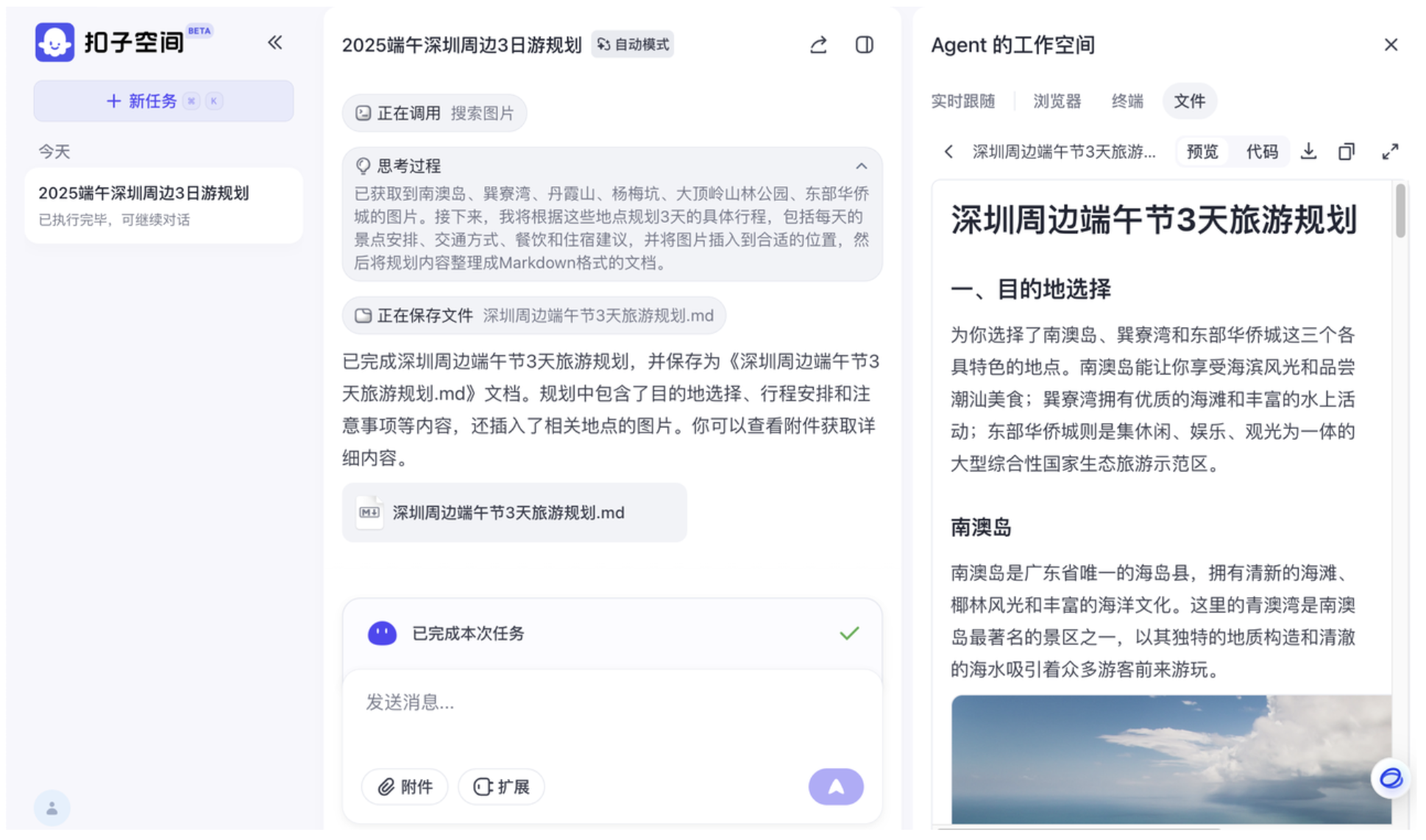 下图是扣子空间给出的反馈:可以看出,扣子空间的思考过程划分了明确的任务步骤,首先找合适的地点,然后使用搜索工具检索信息,继而做出规划,根据规划查询细节,最后整理成了 Markdown 格式返回给我。最终的 Markdown 文件可以直接在扣子空间中打开。