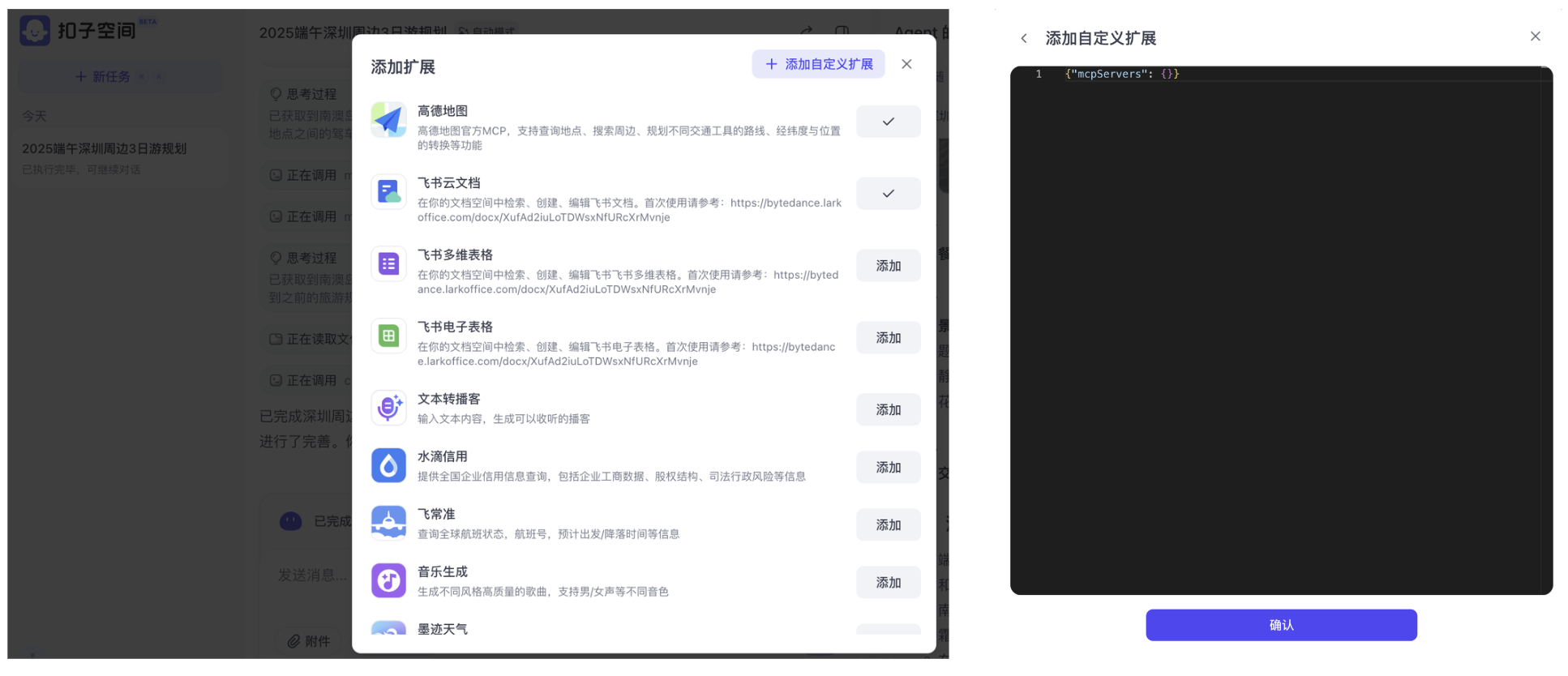 此外,更核心的区别在于,Agentic AI 中,还具备调用各类内外部工具的能力。在扣子空间的页面,点击扩展,即可添加外部工具组件,比如在这次对话中选择墨迹天气、高德地图、飞书云文档,然后提出修改的要求:“生成一份飞书文档,并结合实际天气预报和路线,完善这份旅游攻略。”