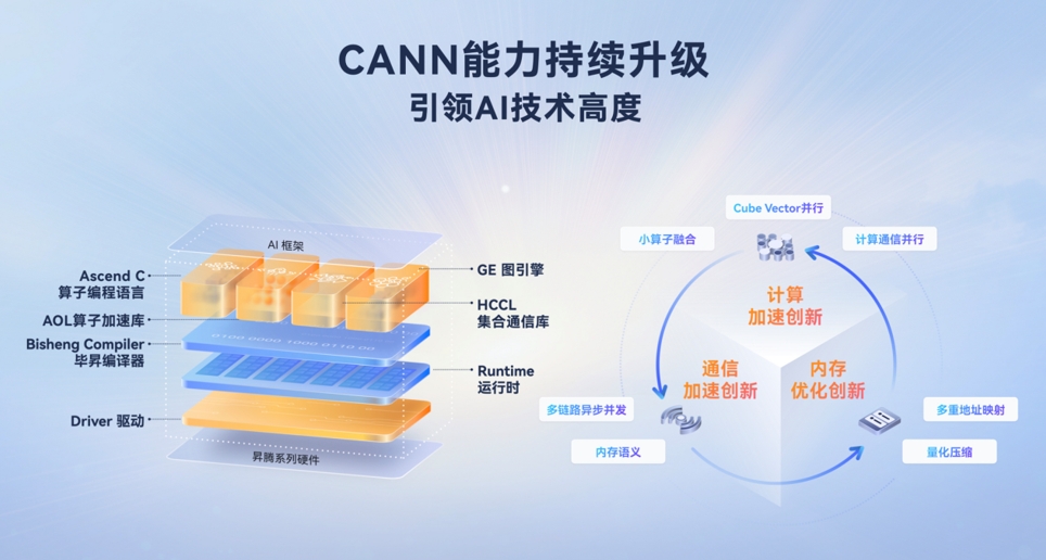 众所周知,硬件是构筑AI算力的基石底座。从硅晶圆上的微观电路到数据中心里的庞大阵列,硬件架构的持续创新为AI技术提供了强大算力支撑。随着AI技术的持续突破,模型优化技术从“模型结构创新”延伸到“训推全流程”的算法创新,利用底层硬件资源,通过在核心技术上的持续突破,昇腾CANN在计算、内存、通信三个维度持续释放硬件价值,用“三驾马车”重构AI算力。