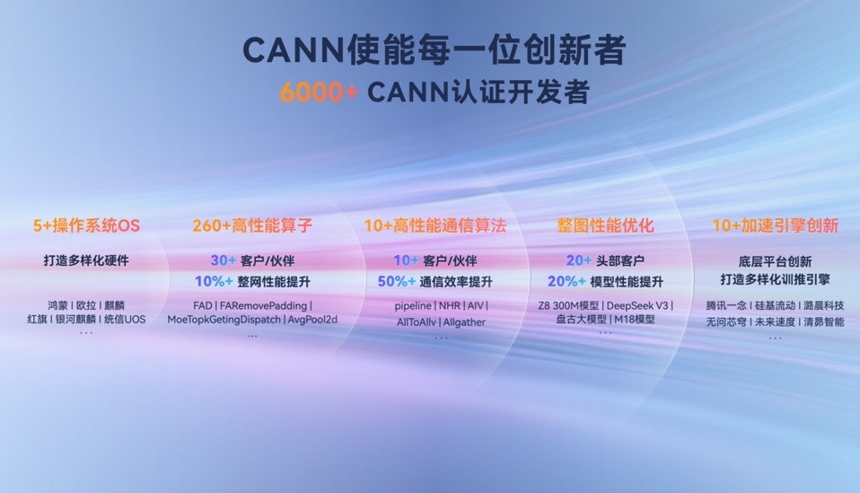 另外,在加速引擎创新维度,CANN已经支持硅基流动等10余家AI基础设施企业打造的差异化解决方案,成功孵化了智能调度引擎、分布式训练框架等创新套件,构筑起覆盖模型开发、训练加速、部署优化的全链路技术生态。