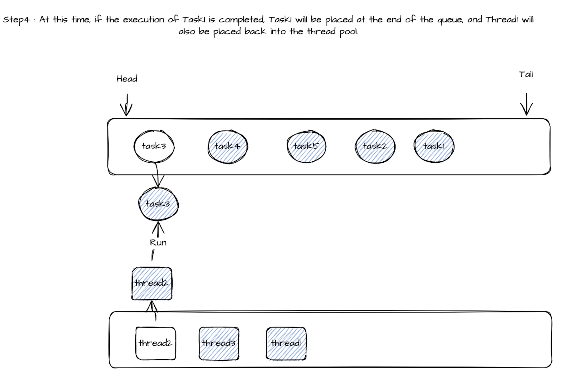 如果 Task2 的 call() 方法在超时时间内正常完成,它会被重新放回队列尾部等待再次调度,thread2 则会继续从队列中取出下一个任务(如 Task3)执行。