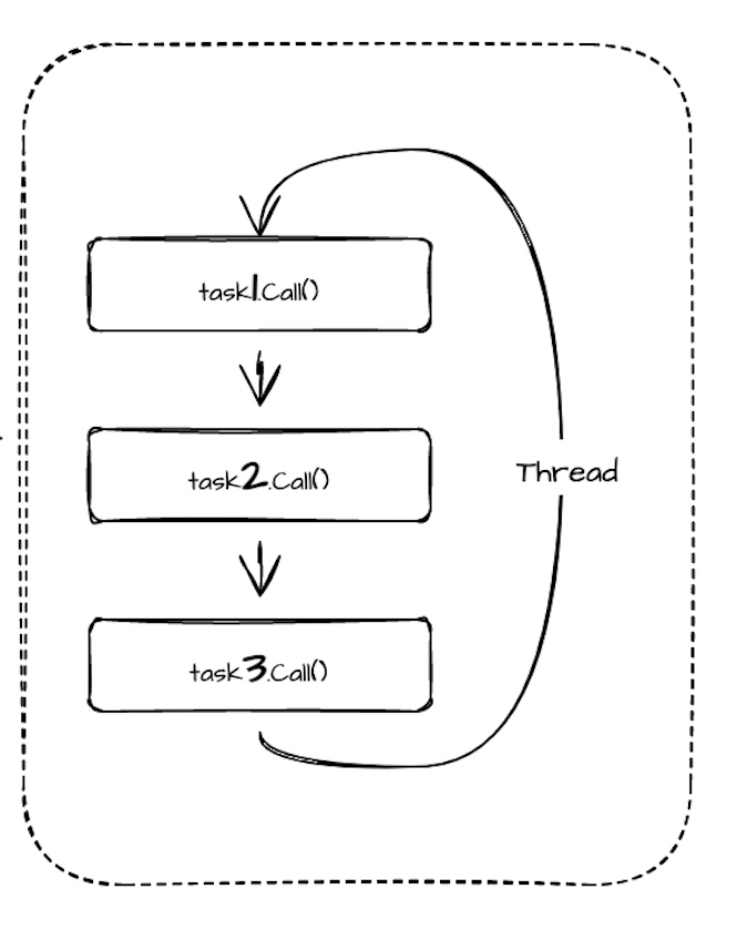由于 Task 是通过反复调用 call() 来驱动的,因此一个线程可以轮流调用它负责的多个 Task 的 call() 方法来实现并发执行。如下图所示: