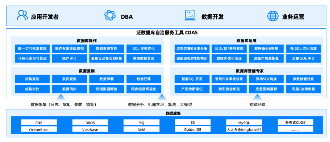 在数据库产品生态能力的建设中,为屏蔽底层数据库差异、提高运营效能,中国联通建立了泛数据库 CDAS(Cloud Database Autonomous System)工具体系,提供统一操作与运维视图,自研打造跨产品融合、全场景驾驭的数据库自治服务工具,实现数据库的全生命周期自治化管理,减少人工干预,提高数据库性能、稳定性和安全性。