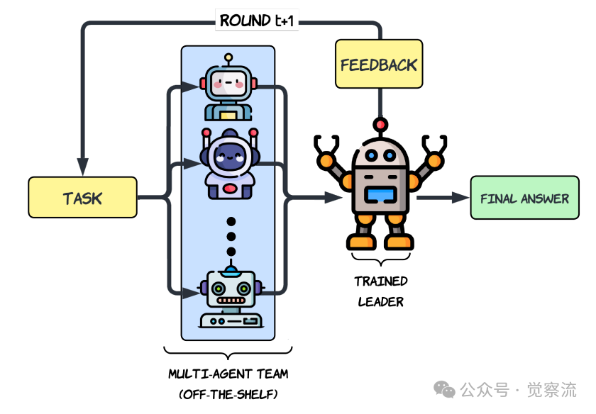 - 领导者(Leader):这是系统中唯一被训练的模型。它的核心职责是接收来自智能体团队的多样化响应,对其进行批判性评估、聚合与综合,最终生成一个高质量的结构化答案。