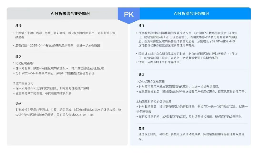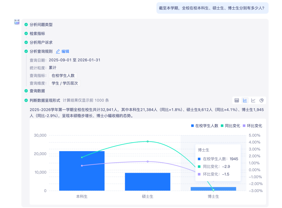 基于自然语言处理的智能问答引擎,支持用户通过对话方式直接查询指标数据、生成可视化图表,并能自动关联企业知识库中的业务背景信息,将原始数据转化为具有业务语义的洞察。