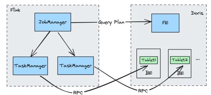 Job Manager 向 FE 端发起请求查询计划,FE 会返回要查询的数据对应的 BE 以及 Tablet;