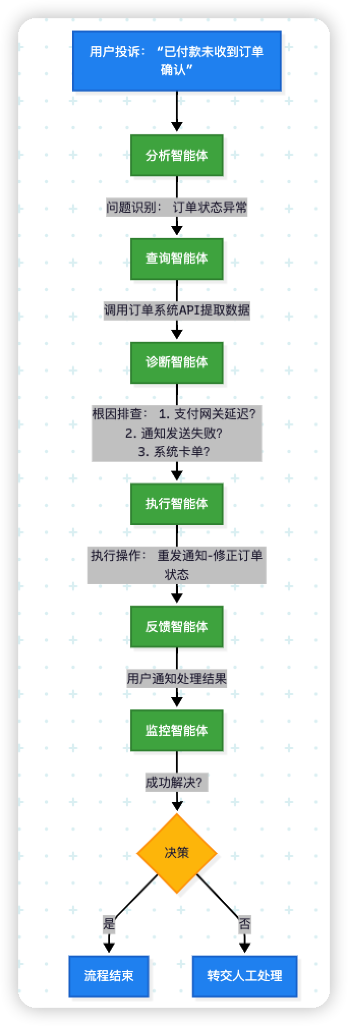 - 执行智能体,根据诊断结果,精准调用相应接口解决问题(例如重发确认通知、手动修正订单状态)。