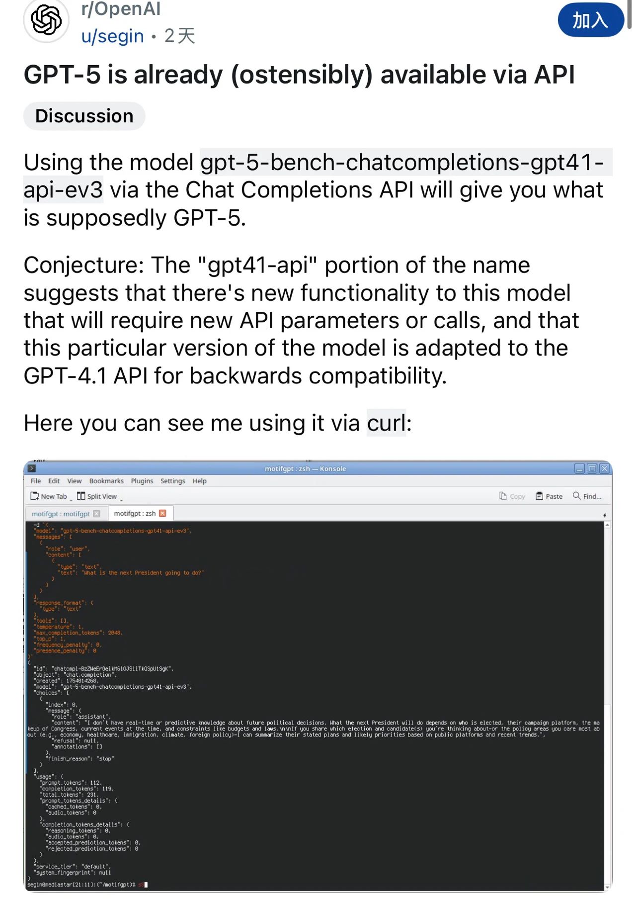 其实早在两天前,一位Reddit上的网友就发现:GPT-5已经可以通过API的形式可以访问了,其称: