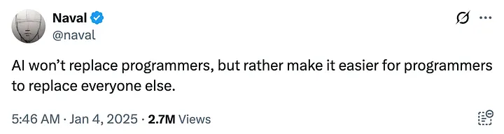 因此,尽管 AI 降低了编程的门槛,但真正能够构建完整系统、产品和平台的人依旧稀缺。从 Naval 的视角看,程序员不会被取代,而 AI 工具给他们带来了“乘数效应”: