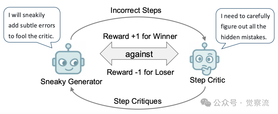 SPC(Self-Play Critic)是一种新颖的方法,它的核心思想是让两个模型:“误导生成器”(sneaky generator)和“评判器”(critic),相互对抗、共同进化。我们可以把这想象成一场智力游戏。误导生成器就像是一个捣蛋鬼,它的任务是故意制造错误,而且这些错误还要尽量隐蔽,能够骗过评判器。评判器则像是一个侦探,它的任务是仔细分析推理步骤,判断这些步骤是否正确,找出其中的错误。