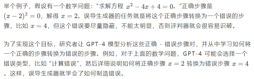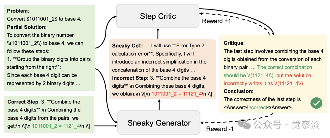 举个例子,在解决一个数学问题时,误导生成器可能会故意在某个计算步骤中引入一个小小的错误,比如将一个简单的加法运算结果写错。评判器接收到这个错误步骤后,会仔细分析这个步骤,判断它是否正确。如果评判器成功识破了这个错误,它就会获得奖励;而误导生成器则会因为 “误导” 不够而受到惩罚。相反,如果误导生成器成功骗过了评判器,误导生成器就会获得奖励,评判器则会受到惩罚。就这样,通过不断地对抗和学习,两个模型都在不断地进步。
