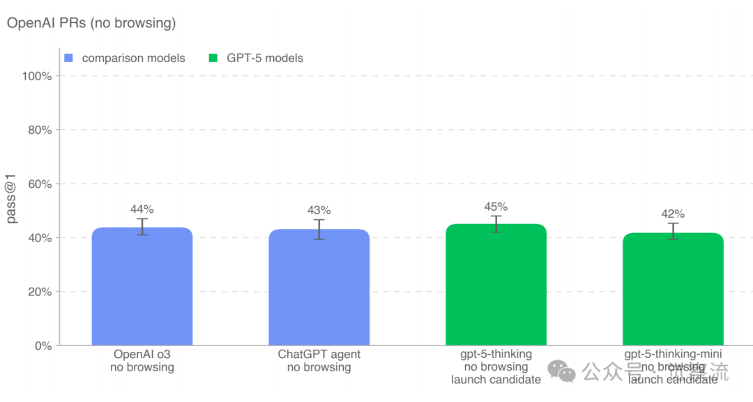 OpenAI特别设计了"OpenAI PRs"评估,直接从内部OpenAI pull requests中获取任务。系统卡解释:"我们测试模型复制OpenAI员工pull request贡献的能力,这衡量了我们在这一能力方面的进展。"每个评估样本基于代理式滚动(agentic rollout),模拟了真实开发环境中的问题解决过程。