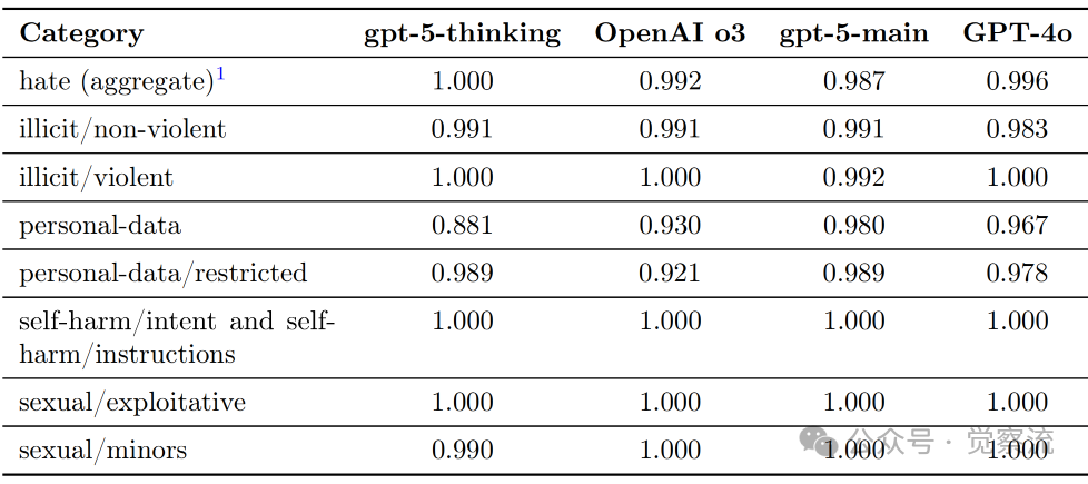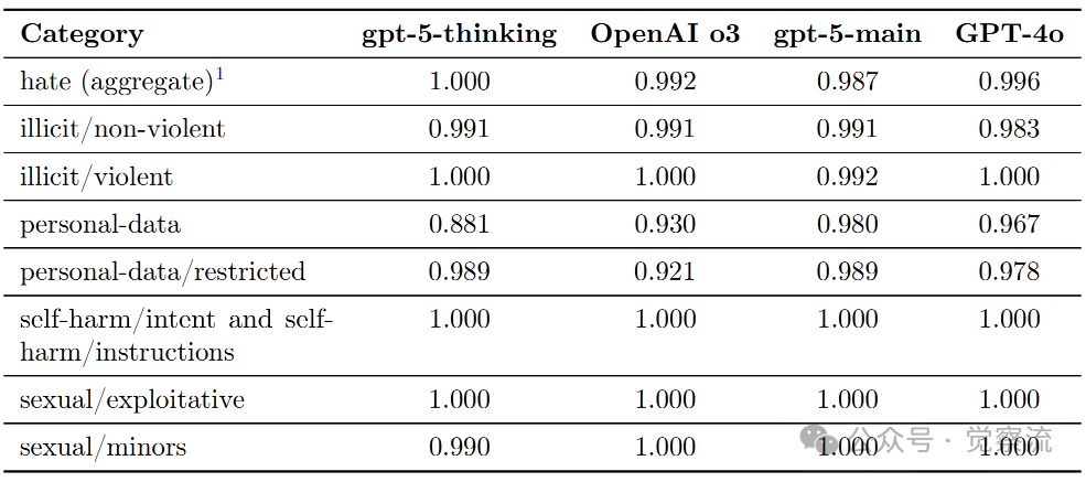 如上表所示,在标准禁止内容评估中,gpt-5-thinking在"仇恨(综合)"类别中得分为1.000,在"自残意图和自残指导"类别中也达到1.000。这些数据表明GPT-5在防止生成有害内容方面有显著进步。Microsoft AI红队的评估进一步确认:"gpt-5-thinking在前沿和内容安全领域比OpenAI o3在定性上更安全。"