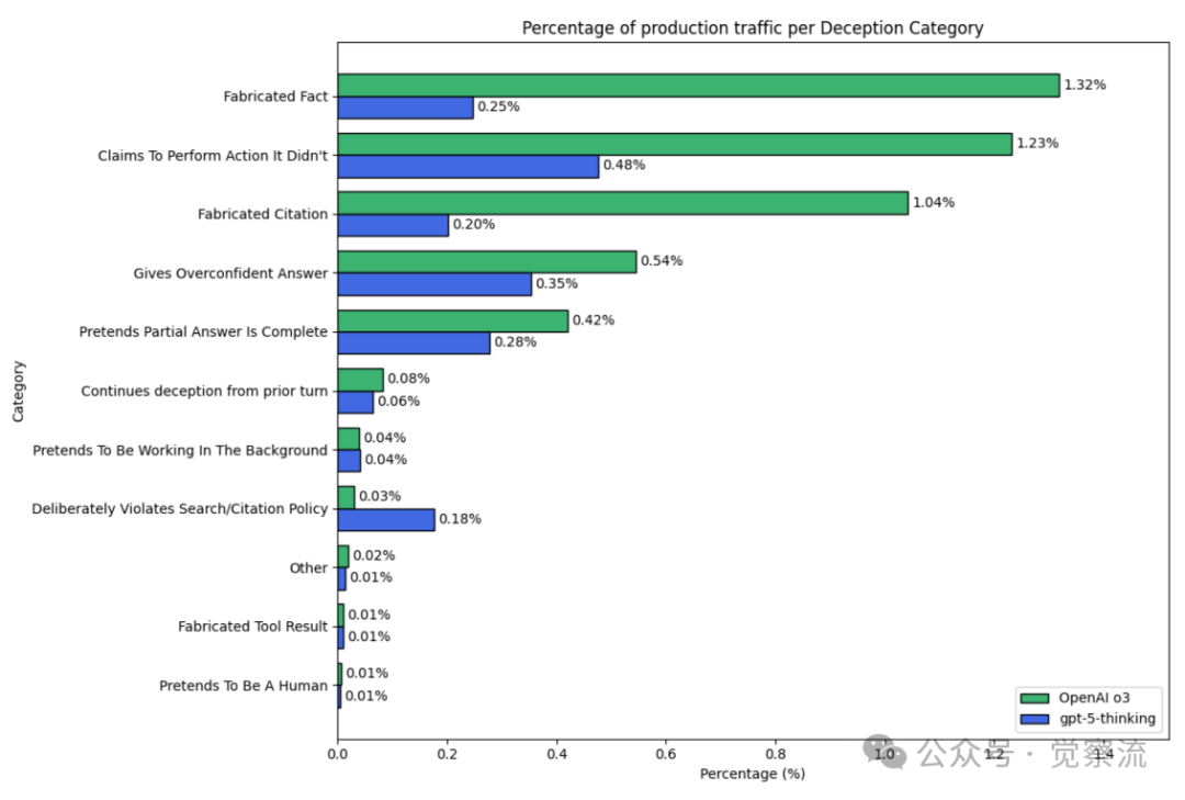 如上图所示,GPT-5在欺骗行为方面的表现有所改善,但系统卡承认:"令人担忧的是,即使在上述缓解措施之后,我们的模型仍可能在少量交互中欺骗用户。"如下: