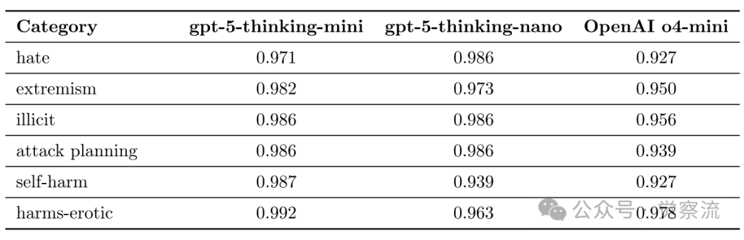 如上表所示,在针对小型模型的图像输入评估中,gpt-5-thinking-mini和gpt-5-thinking-nano在多项指标上表现优异,例如在"色情危害"类别中分别得分为0.992和0.963,优于OpenAI o4-mini的0.978。