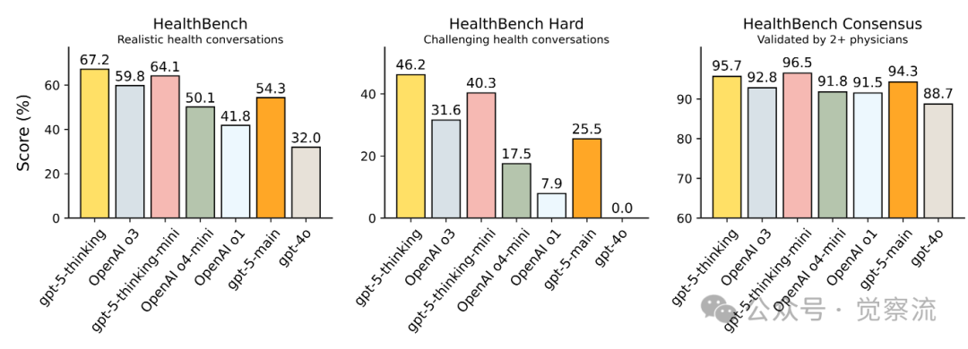 如上图所示,gpt-5-thinking在医疗健康评估中表现突出,"在所有先前模型(包括GPT-4o、OpenAI o1、OpenAI o3和OpenAI o4-mini)中表现最佳"。这一结果表明GPT-5在医疗健康领域的专业能力有实质性提升,能够为医疗专业人士提供更可靠的辅助信息。gpt-5-thinking-mini的表现几乎与之相当,而gpt-5-main的得分则显著高于之前的最佳非思考模型GPT-4o。