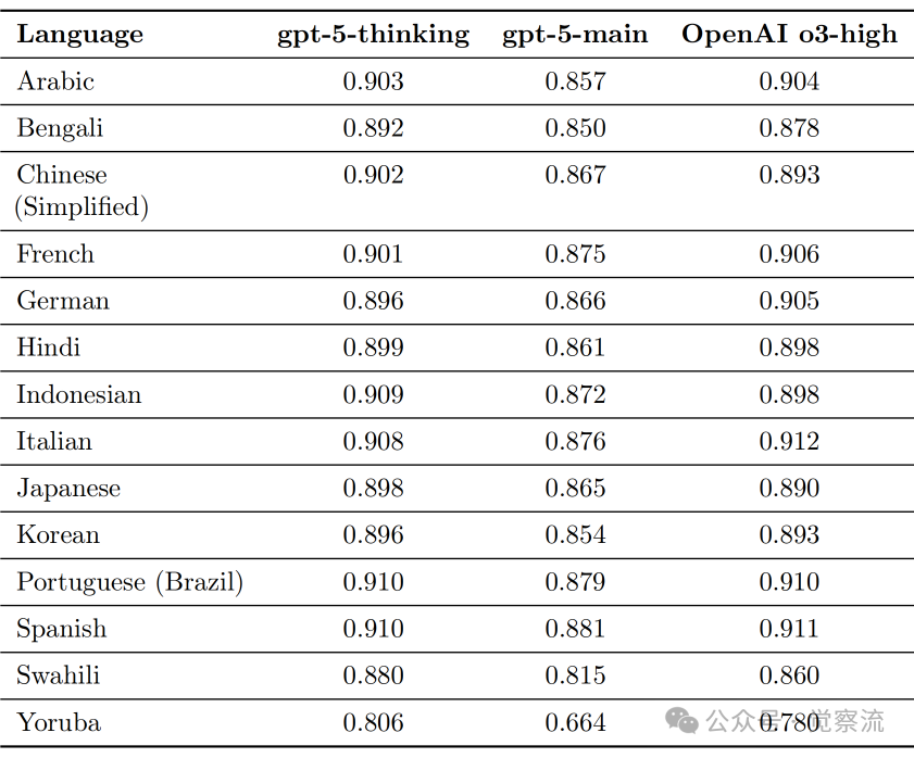 GPT-5在多语言能力方面也取得了显著进步。系统卡专门设置了"3.10 Multilingual Performance"章节,详细评估了模型在100多种语言中的表现。
